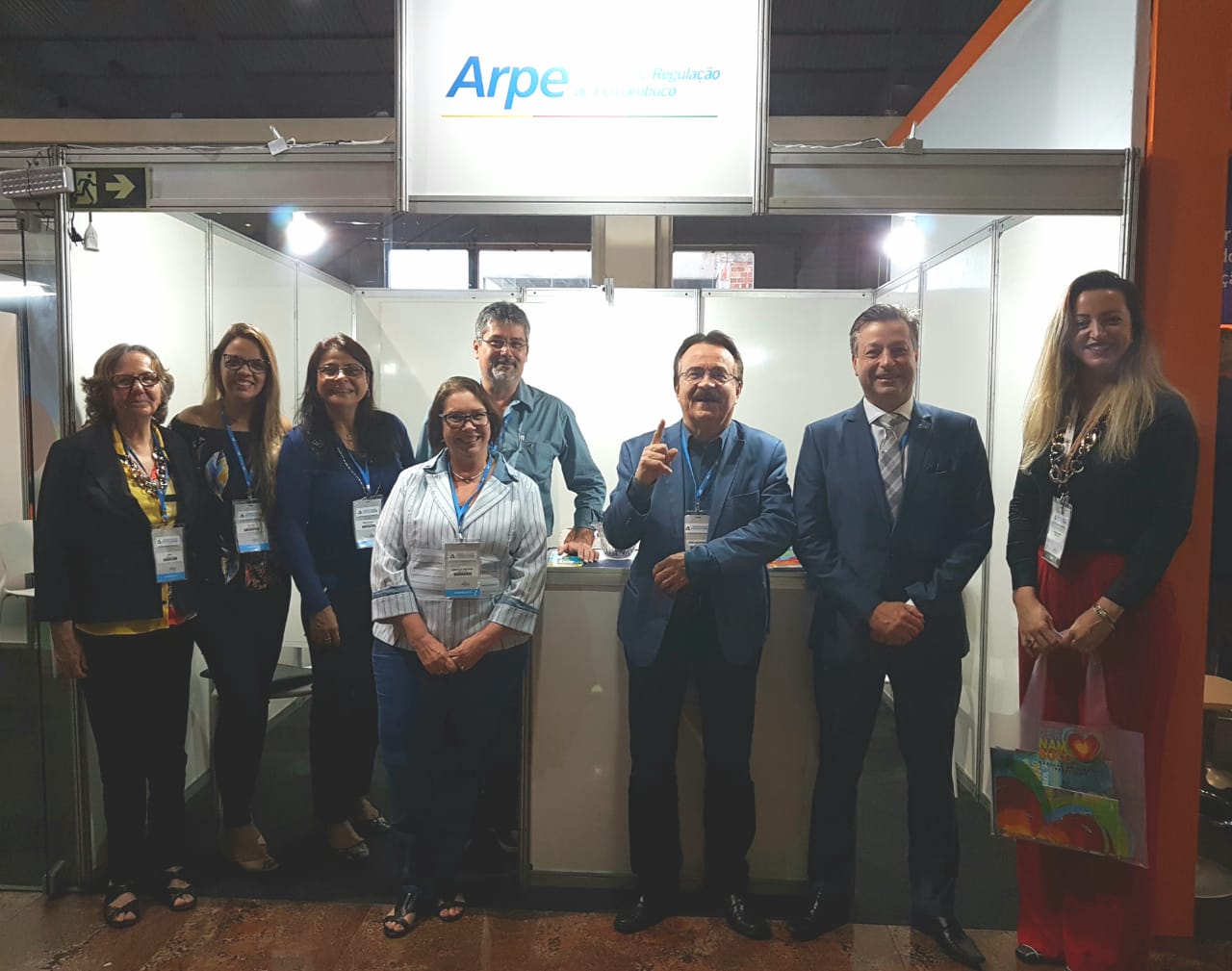Registro da visita ao estande da Arpe do atual presidente da ABAR, Fernando Alfredo Rabello Franco e de sua assistente, que foram recepcionados pelo diretor de Regulação Econômico-Financeiro, Fred Maranhão, pela coordenadora de Tarifas e Estudos Econômicos-Financeiros, Ângela Freitas, pelos técnicos reguladores Alexandre Almeida, Graça Reis e Auxiladora Luna, além da secretária executiva, Silvia Melo. Fernando Franco que também é presidente da ARCE foi pessoalmente agradecer à representativa e atuante comitiva da Arpe que se fez presente no Congresso.