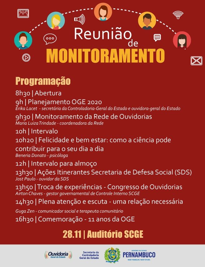 Começou hoje (28) a 4° Reunião de Monitoramento da Rede de Ouvidorias do Estado, o encontro, que prevê a troca de experiências e avaliação de resultados do semestre, será realizado das 8h30 às 16h30, no auditório da Secretaria da Controladoria-Geral do Estado (SCGE) – a qual a OGE é vinculada -, no bairro do Espinheiro, no Recife. A ouvidora da Arpe, Paula Lima e Sandra Rocha representando a equipe da Ouvidoria, estão presentes no encontro, essa será a segunda participação de Paula desde que assumiu a Ouvidoria da Arpe. A diretora da Diretoria da Ouvidoria-Geral do Estado (DOGE), Zélia Correia, está presente para repassar os pontos mais relevantes do semestre.