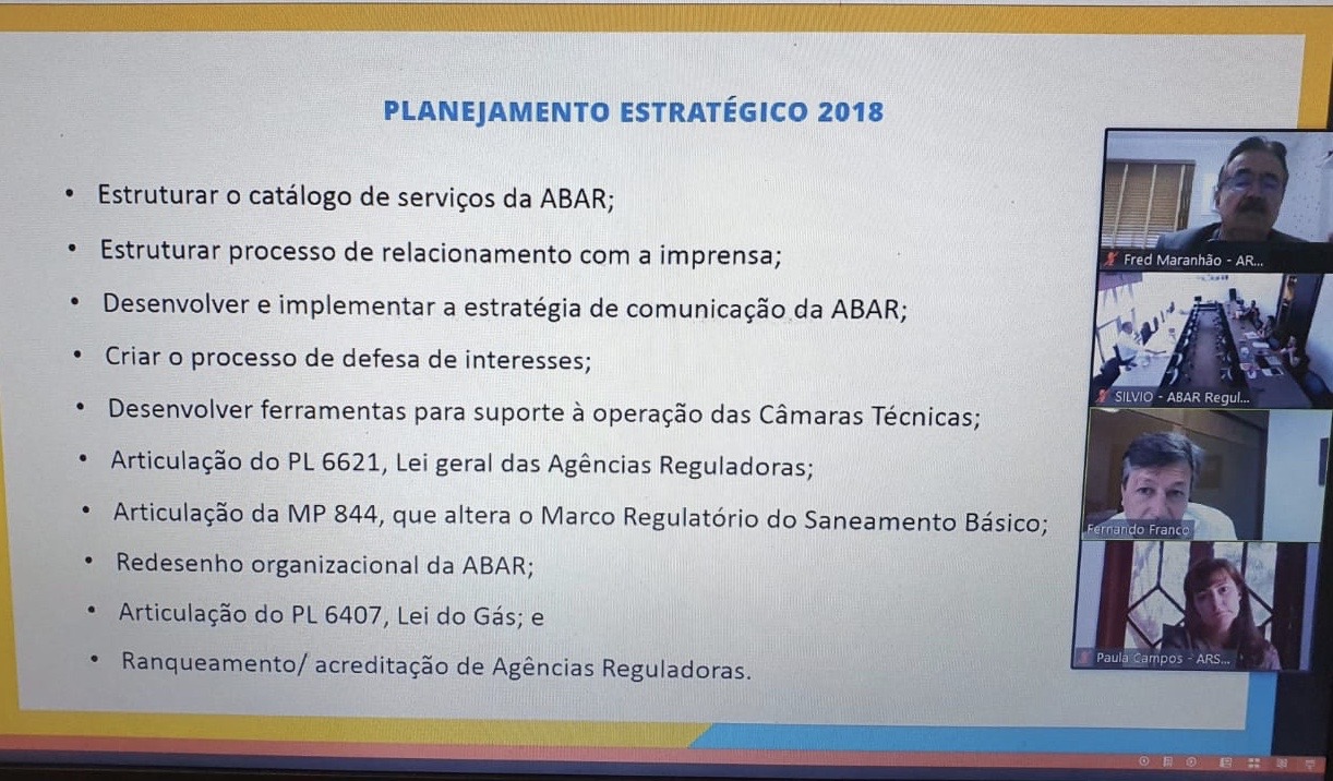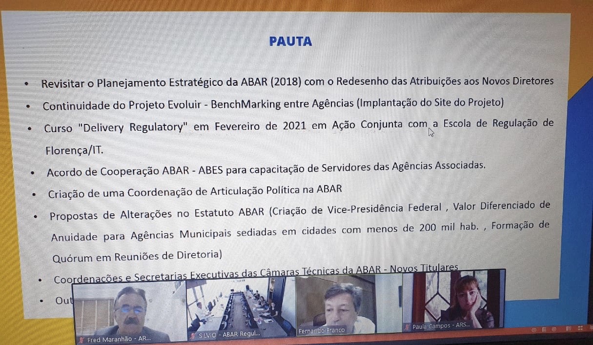 A ABAR (Associação Brasileira de Agências de Regulação) realizou nesta sexta-feira, 11 de setembro de 2020, a primeira reunião de sua nova diretoria recém empossada.