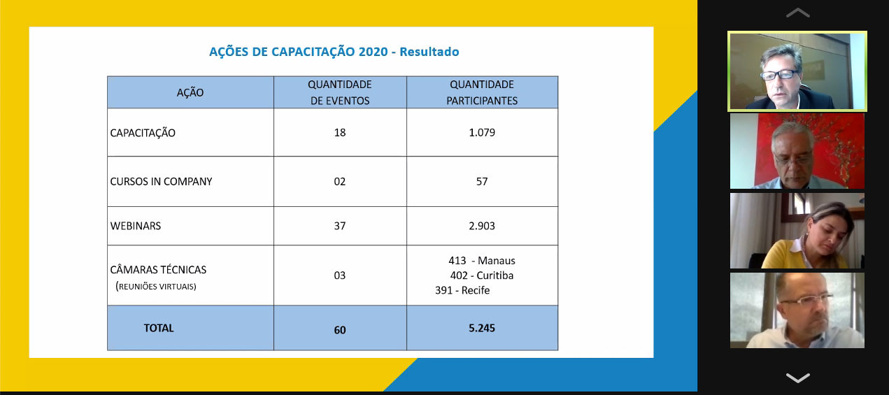 No início do encontro, o presidente Fernando Franco apresentou aos presentes um balanço dos eventos realizados pela ABAR em 2020, ressaltando que mesmo durante a pandemia de Covid 19 a entidade vem se mantendo em plena atividade. Ao longo de 2020, a ABAR promoveu 20 cursos, 37 webinars e três rodadas de reuniões de Câmaras Técnicas, totalizando 60 eventos que contaram com 5.245 participantes. “Um feito extraordinário tendo em vista as dificuldades geradas pela pandemia”, comentou Franco.