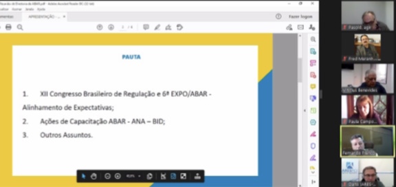 Também foi abordada na reunião a possibilidade de a ABAR tornar-se provedora de conteúdos de capacitação para os cursos que a ANA (Agência Nacional de Águas e Saneamento Básico) pretende oferecer no segundo semestre deste ano, em plataforma própria, com foco no Novo Marco Legal do Saneamento.