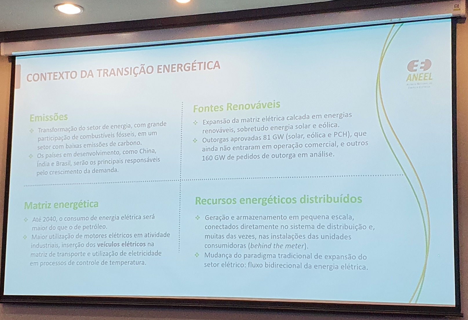 Tela com parte do resumo do Contexto da Transição Energética contido na apresentação do Diretor-Geral da ANEEL, Sandoval Feitosa.
