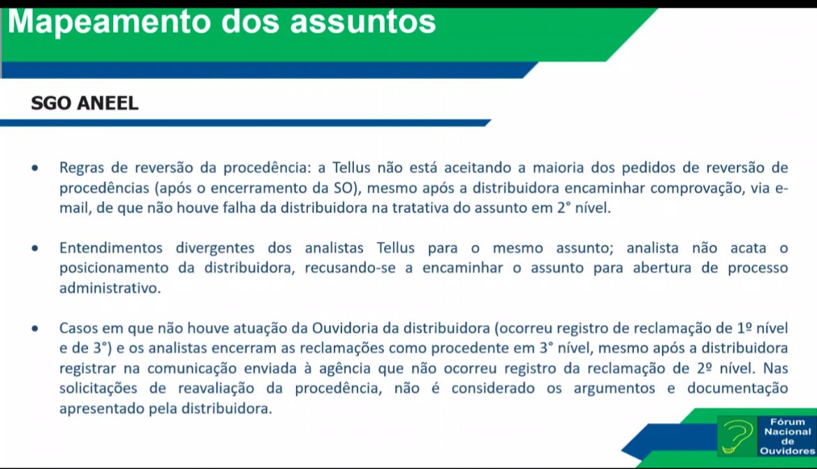 Aconteceu na manhã desta quarta-feira (16/11), a Primeira Reunião Ordinária do Fórum Nacional de Ouvidores do Setor Elétrico, em ambiente virtual por meio do Microsoft Teams. O objetivo desse evento é discutir assuntos afetos às atividades de Ouvidoria.