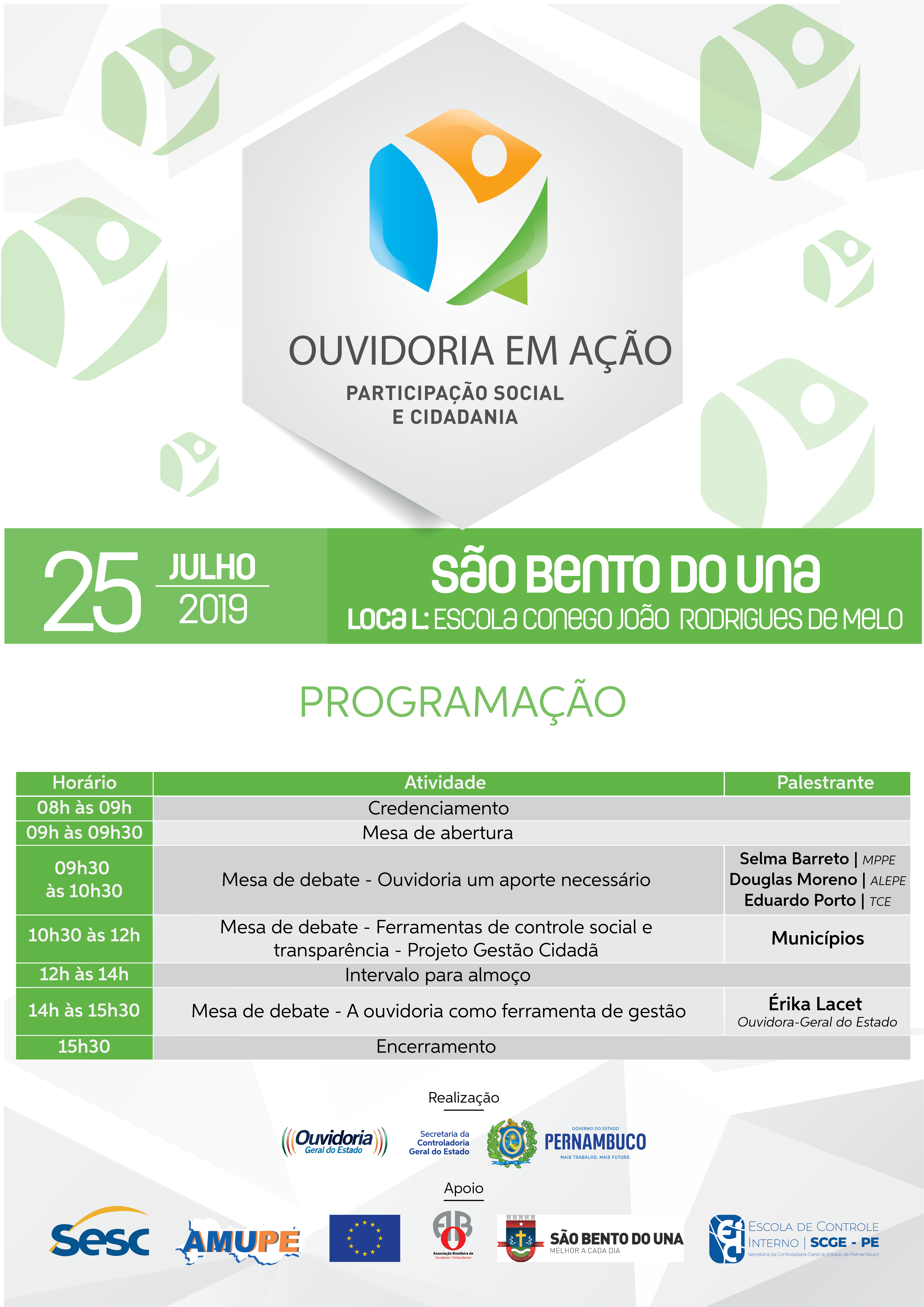 O papel da Ouvidoria-Geral do Estado, cidadania, controle social, transparência pública e boas práticas em ouvidoria serão os temas abordados nas palestras e mesas de debates programadas. As experiências exitosas de ouvidorias municipais também farão parte da discussão. Em Garanhuns, o Ouvidoria em Ação acontecerá durante o 29ºFestival de Inverno da cidade, das 8h às 17h30, no auditório do Serviço Social do Comércio (SESC).