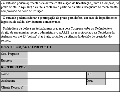 CONSIDERANDO o disposto na Resolução ARPE nº 270, de 25 de setembro de 2024, especialmente, o art. 17 que dispõe que a COMPESA deverá apresentar o modelo de Termo de Ocorrência de Irregularidade (TOI) à ARPE para homologação,