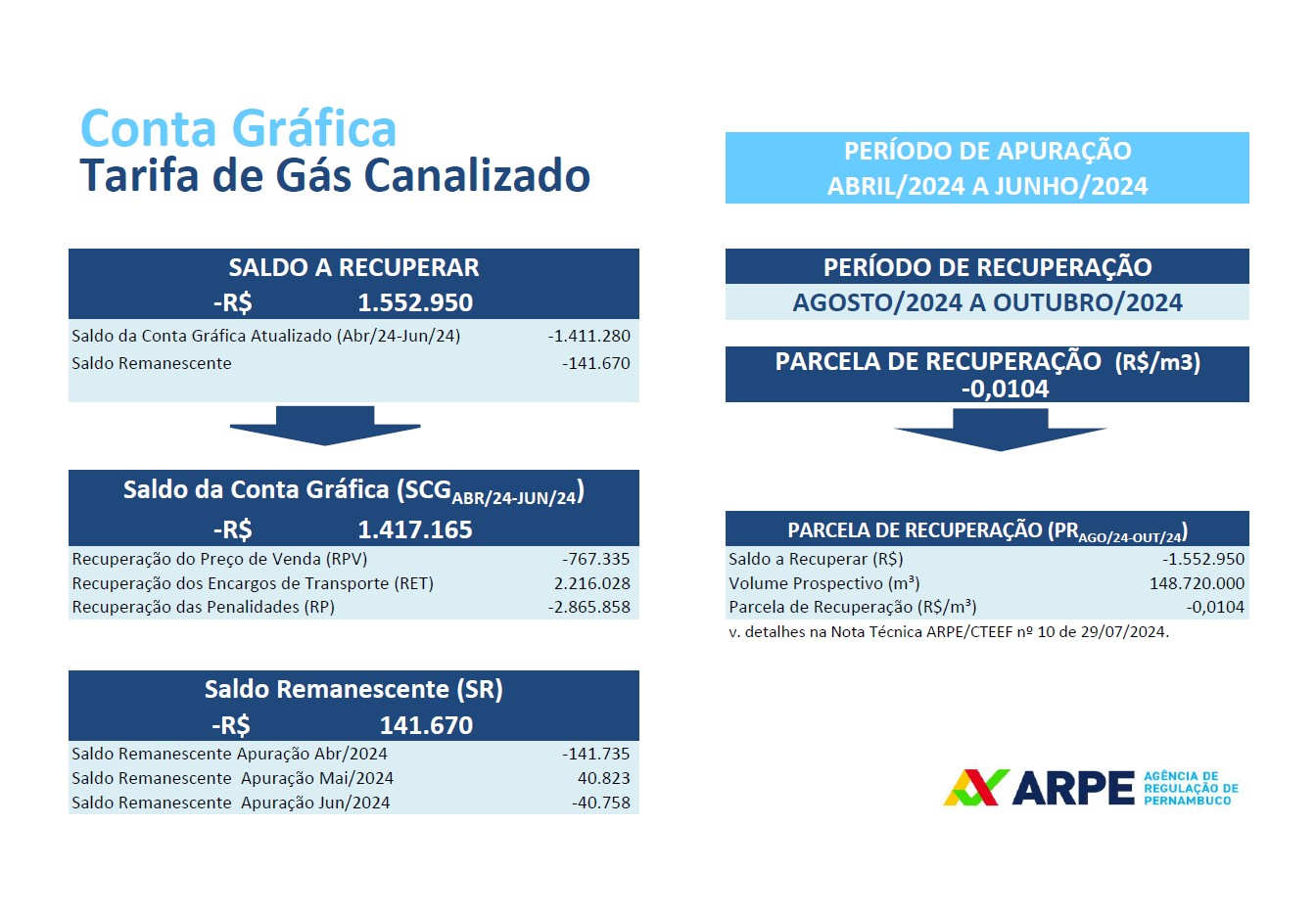 Conforme previsto na Resolução ARPE nº 216/2022, a primeira aplicação do mecanismo de Conta Gráfica teve o período de apuração superior a três meses, ocorrendo excepcionalmente em nove meses (janeiro a setembro de 2022), cuja recuperação foi calculada em período equivalente (novembro de 2022 a julho de 2023).