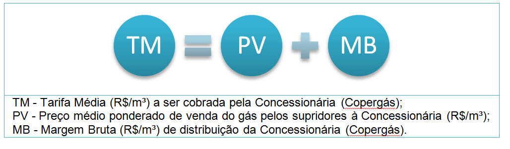 As tarifas para a distribuição do gás canalizado no Estado de Pernambuco são compostas pelo preço de venda do gás (PV) pelos supridores e a margem de distribuição (MB) da Copergás, conforme definido no Contrato de Concessão.